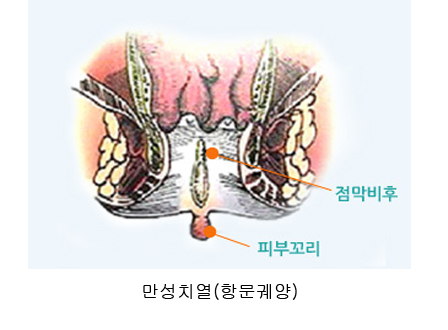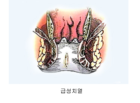 치열은 항문 하부의 피부가 직장안쪽으로 약 1cm정도 찢어지는 열상입니다.